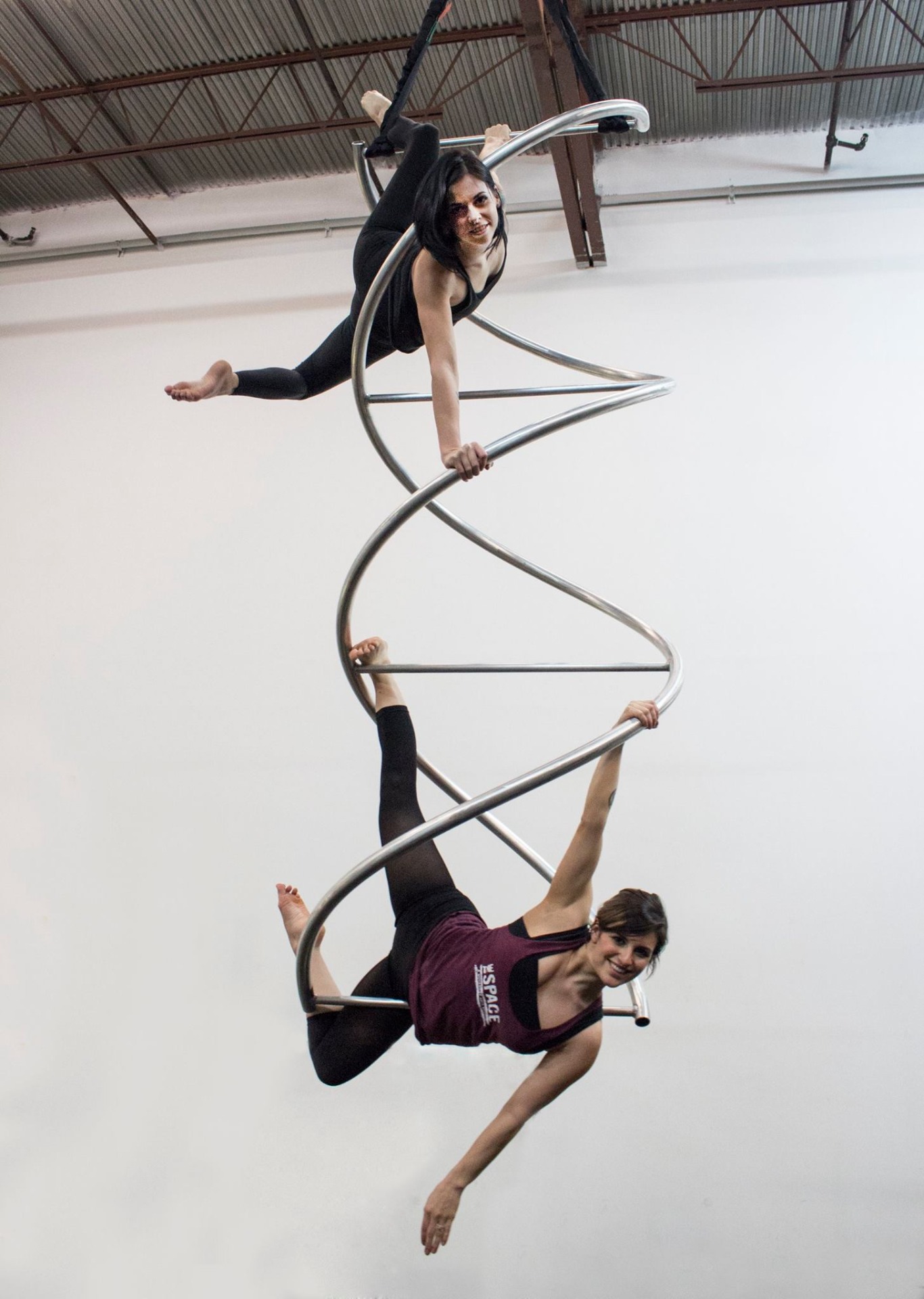 McKinley constructed a 6 foot long, steel double helix as a scaffold for the aerial dance performance. The dance performance illustrated day/night cycling and the gradual building of complexity through polymerization.